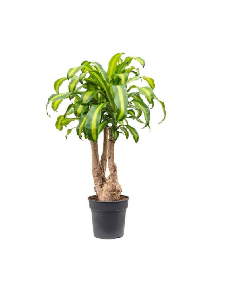 A popular indoor plant with green leaves featuring vibrant yellow stripes. Grows on thick cane-like stems and is valued for its air-purifying qualities and low maintenance.